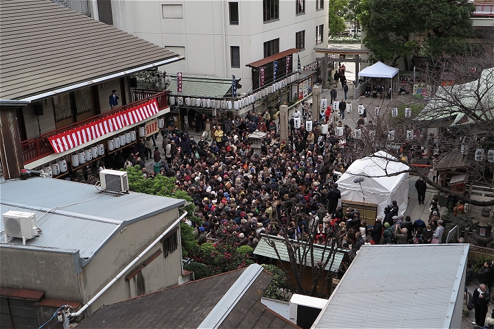 実は「日本クラウン新春!歌う王冠 2015」というのがあり、 日本クラウンの歌手さんたちが、「今年もヒットしますように」と祈願し、歌を奉納するためです。 なんと今年は総勢22名ということで、歌手さんてんこ盛りでした。 予定では23人だったらしいのですが、インフルエンザで1人ダウンとなったそうです。 女性は和服姿も多く、振る舞い酒もあり、まさにOichan好みのイベントです。 昨年は、ちょっとしたトラブルがあり、行くことができませんでしたので、今年こそ・・・・・ と ところがどっこい、今年はその前日、昨年よりもっとひどいトラブルに巻き込まれてしまいました。 後手をひかれる思いでしたが、行くことに・・・ もう境内は人で一杯です。 本殿の前、向こうの方に歌手さんたちが、ちらりちらりと・・・