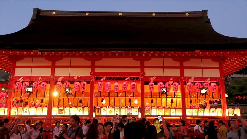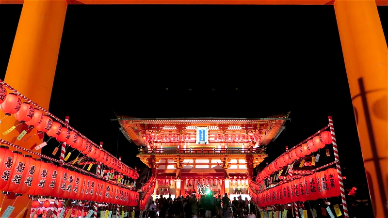 伏見稲荷大社です。 21日と22日はこのお稲荷さんの本宮祭なのです。 そして夜には石灯篭・数千に及ぶ献納提灯に灯を点ずる万灯神事が行われます。 宵宮は午後6時からということなので、5時半すぎに到着しました。