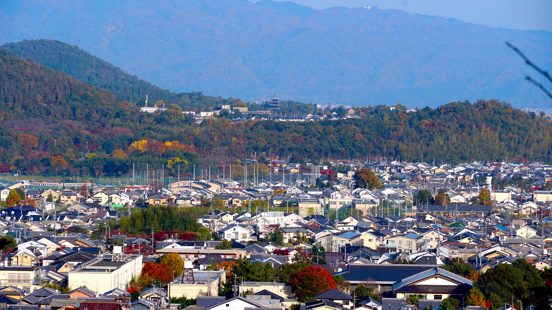 多宝塔の裏には展望台に行く道が・・・ はるか彼方にうっすらと京都タワーが・・・